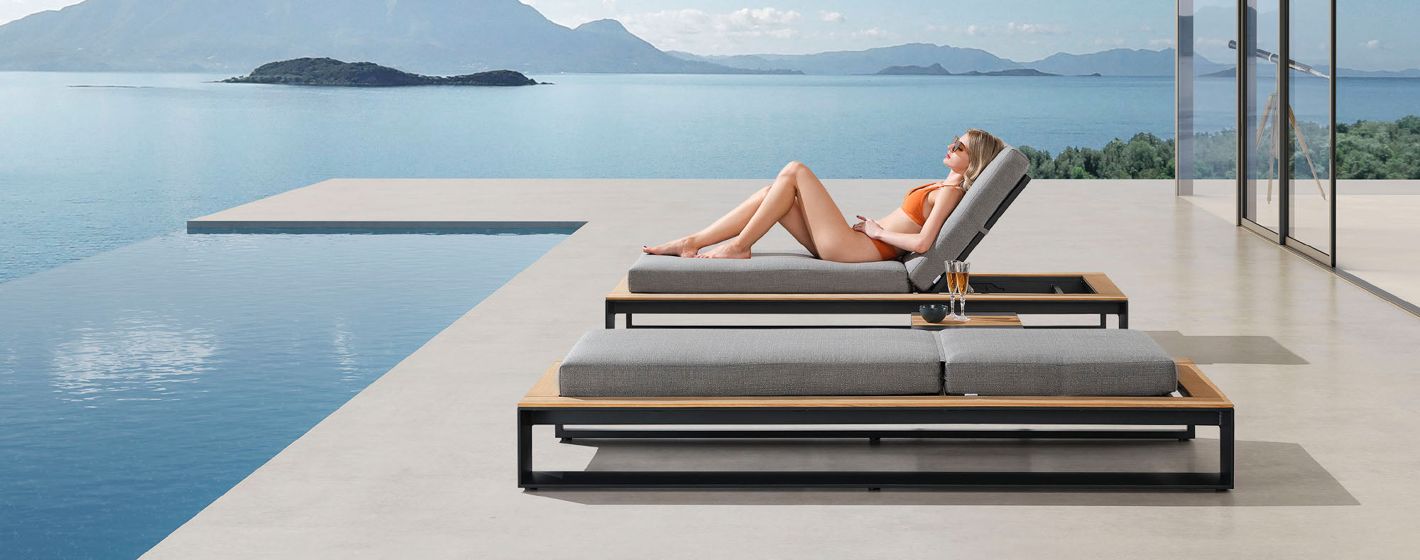 - The aluminum used is rustproof and suitable for outdoor use. The tabletops and sun lounger frames are made from weather-resistant teak wood.