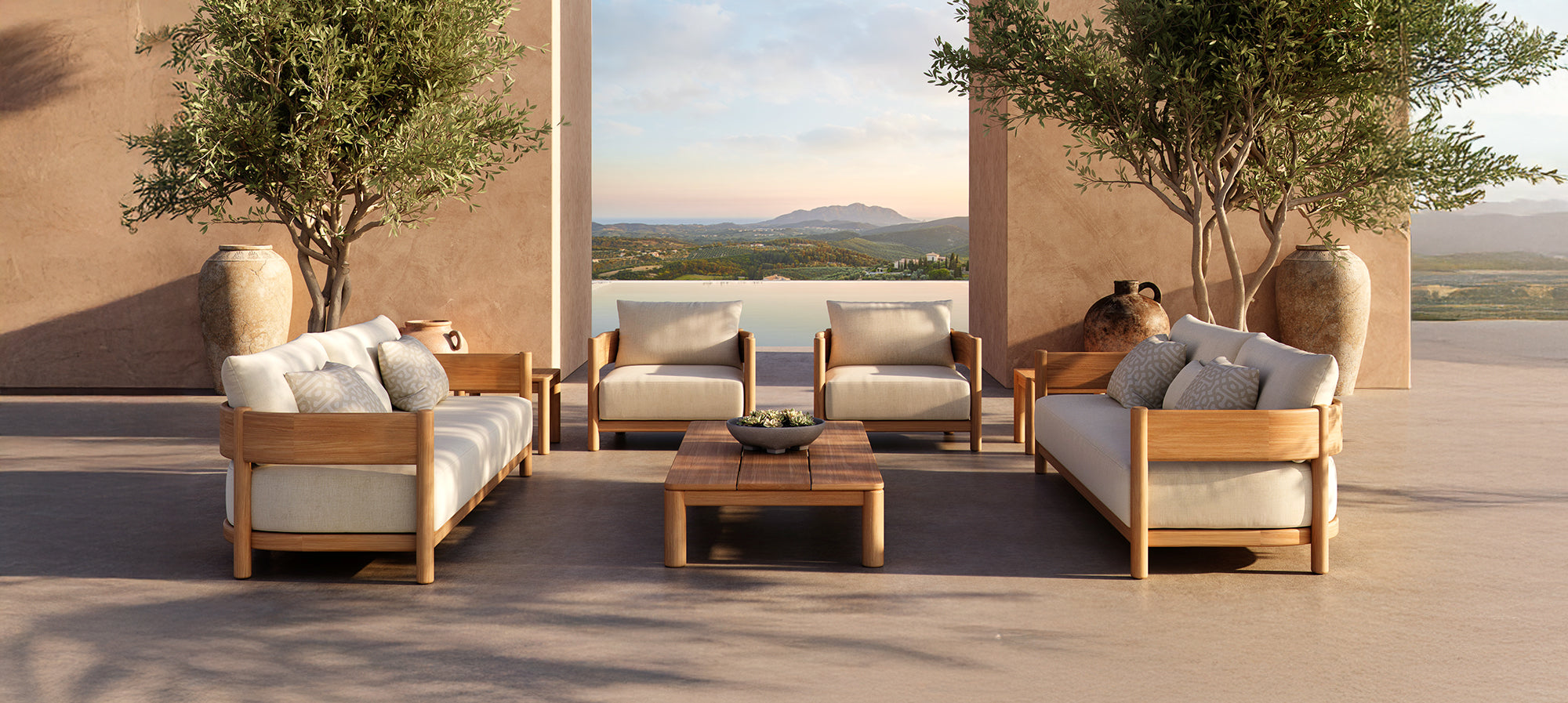 Doğal teak yüzey, dış mekânda kullanım için neme, güneş ışınlarına ve değişken hava koşullarına karşı yüksek direnç sunar.